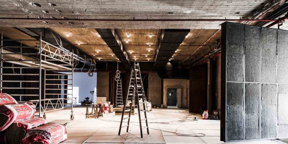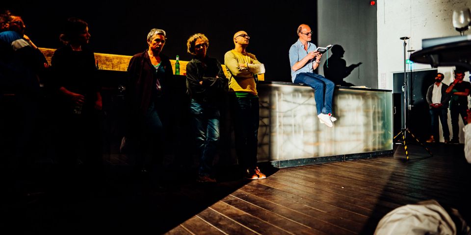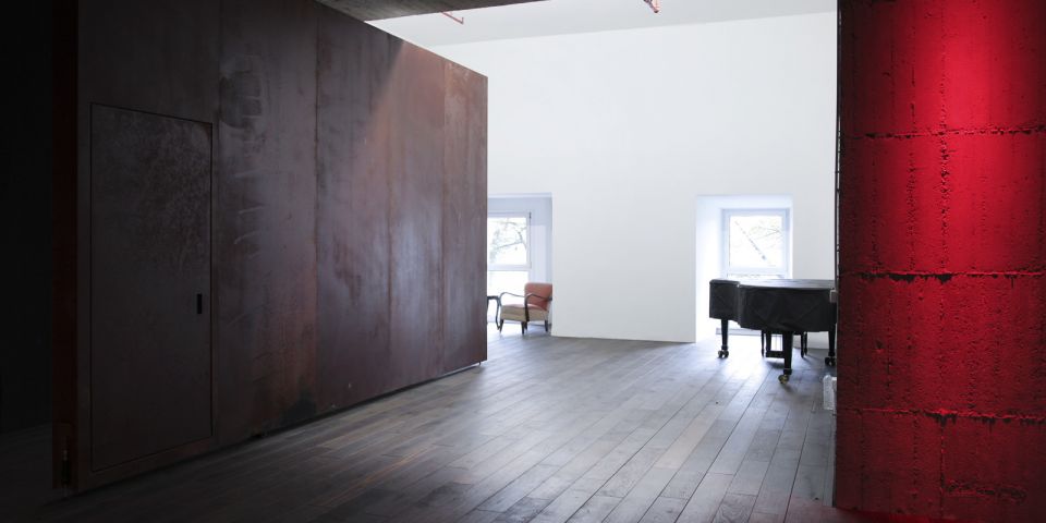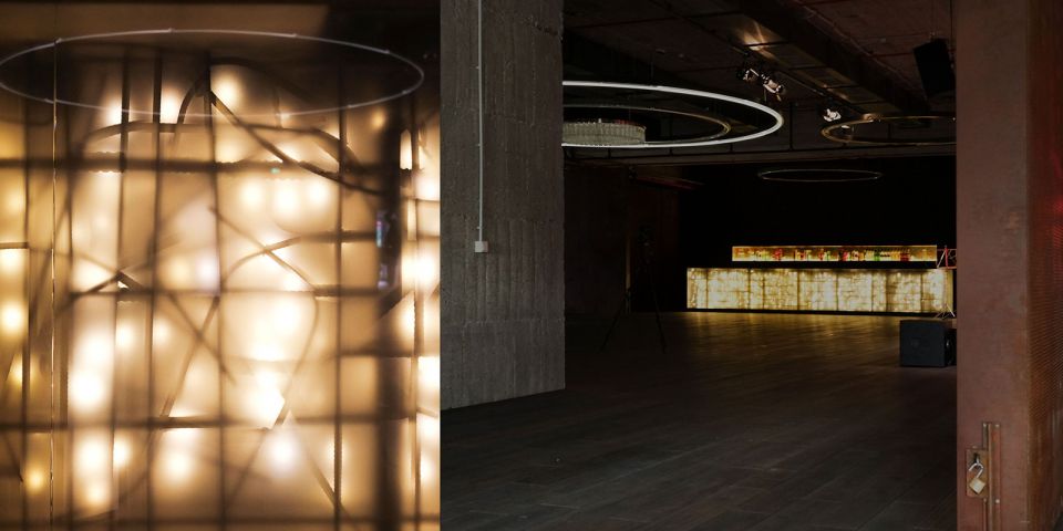 Große drehbare Eisentore steuern die Akustik des Raumen und ermöglichen eine große Gestaltungsfreiheit für die Nutzung. Offene Betonwände erzählen von seiner Geschichte, während die große, leuchtende Bar, ein warmer Holzfußboden und die offene Raumgestaltung ihn zum einladenden Ort der Begegnung werden lassen. »Echtheit, Minimalismus, Reduktion« waren die Primäraufgaben der Architekten, so Prof. Jörg Friedrich. Auch das Lichtkonzept wurde von Heinz Kasper gezielt für den Raum entworfen und ist Teil seiner kunstvollen Gestaltung: Ein Kronleuchter aus 270 illuminierten PET-Flaschen hängt inmitten großer Ringleuchten und setzt der kantigen Architektur organische Formen entgegen. Eine Referenz an alte Konzertsäle, zeitgenössisch interpretiert.
