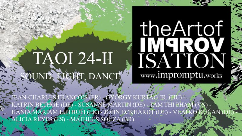 Wobei auch diesmal - wie stets bei TAOI - auf der Bühne des resonanzraums St. Pauli eine Begegnung von Performer:innen verschiedener kultureller Backgrounds und Generationen stattfindet: aus Ungarn und Frankreich kommen die beiden »Altmeister« der zeitgenössischen Musik György Kurtag jr. (electronics) und Jean-Charles François (percussion), aus Berlin die Tänzerin und »Improvisationsforscherin« Susanne Martin, aus Hamburg der großartige »Genrespringer« John Eckhardt (double bass) und der Gastgeber Vlatko Kučan (reeds). Die jüngere Generation wird repräsentiert durch die aus Sri Lanka stammende Sängerin Hania Mariam Luthufi, die spanische Pianistin Alicia Reyes, den brasilianischen Komponisten Matheus Souza (violin, electronics) und die vietnamesische Performerin Tam Thi Pham (dan bau). Und last-but-not-least wird die in Hamburg ansässige Lichtkünstlerin Katrin Bethge mit ihren live-painting Projektionen den Abend zu einem multimedial-transdisziplinären Erlebnis werden lassen.